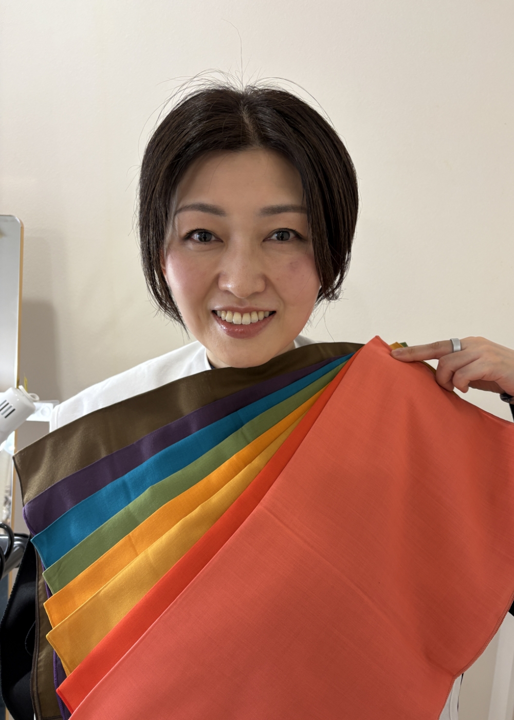 診断では秋の紅葉のような深みのある色がとても似合うタイプとのことでした。今まで避けていた濃い色も、実は自分の魅力を引き立ててくれる色だと分かりとても驚きました。ボリューム感や華やかさのあるファッションも似合うと教えていただき、コーディネートの幅が一気に広がった気がします。これから服選びがますます楽しみになりそうです。